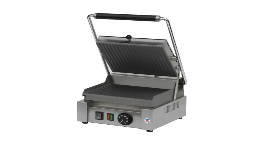 Kontaktni roštilj s rebrastim dnom i gornjim limom za pečenje, regulacijom temperature između 50...300 °C.