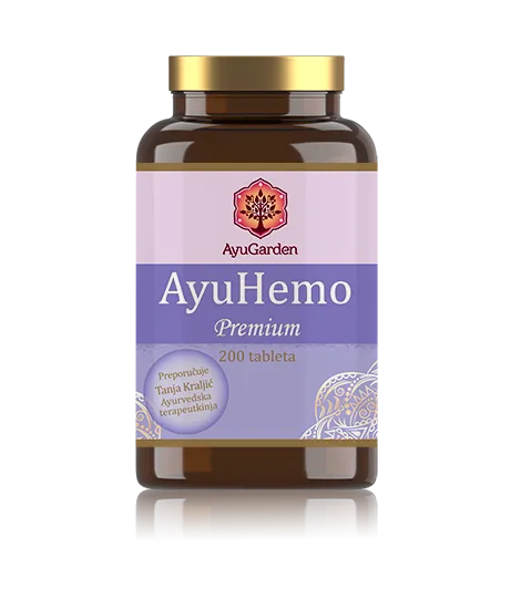 AyuHemo je mješavina probranih ayurvedskih biljaka koje potiču ublažavanje hemoroida. Lubrikativna i laksativna svojstva (Suran, Triphala i Senna) omekšavaju i olakšavaju stolicu i konstipaciju. Antioksidativna i hemostatska svojstva (Nagkeshar) pomažu u smanjenju prekomjernog krvarenja. Protuupalna svojstva mogu kontrolirati oticanje hemoroida.