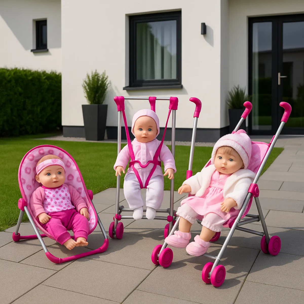 Set za igranje uključuje:dječja kolicaležaljkaljuljačkaBebe nisu uključene u set