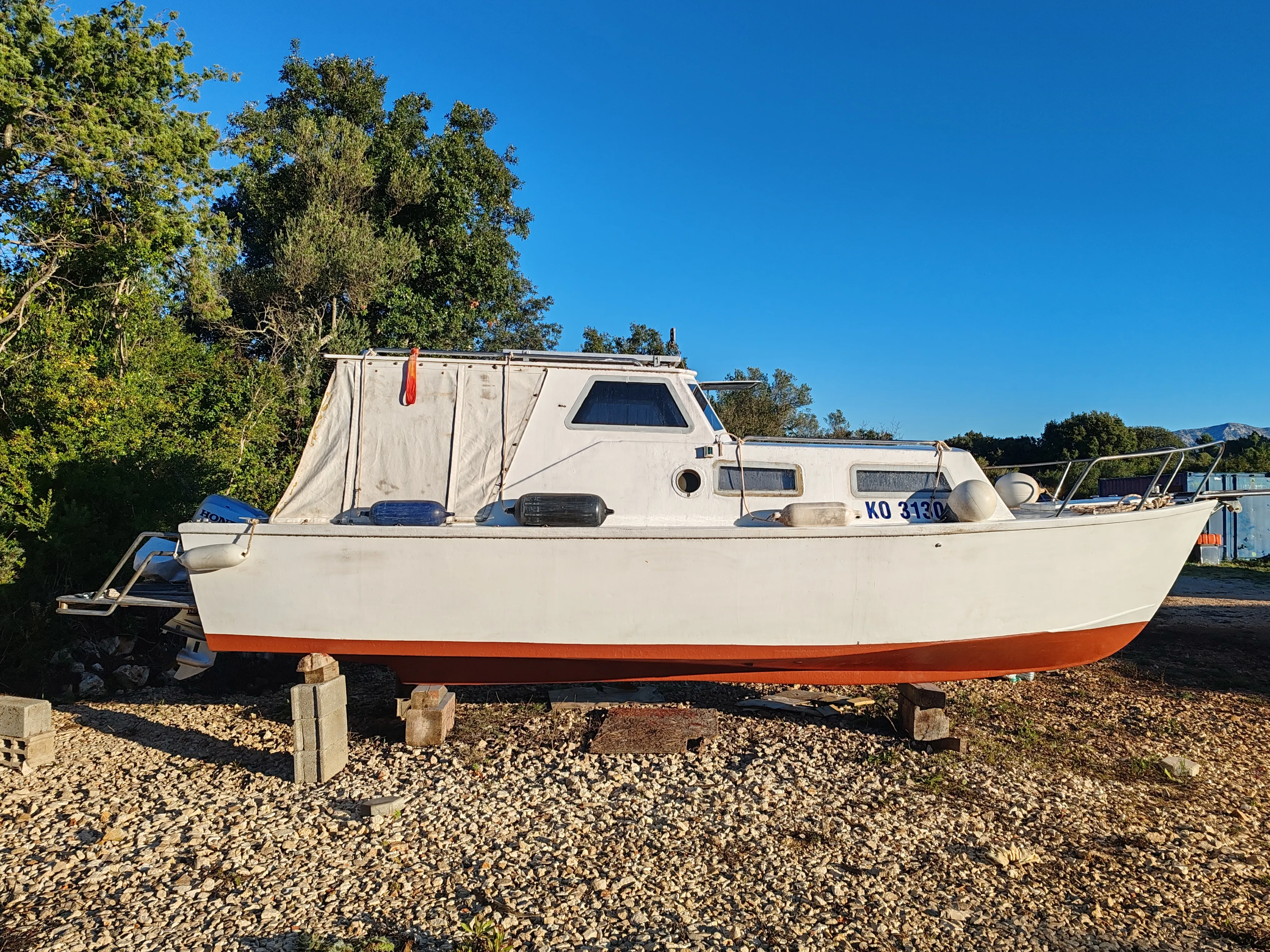 Pilotina van de Stadt, barka 7.0m, vodonepropusna šperploča plastificirana,platforma metar+spirun po metra-8.5m preko svega. Kabina vrlo komotna za dvoje sa spužva-kušini, wc, kuhalo, sklopivi stol, sidite,pod pajolima dva akumulatora, 4 pumpice za sekanje, solari, vhf, eho sonder, radio+zvučnici, vanjski roštilj, motor Honda 50+rezervar 30l,cruising brzina 10 milja/max 15milja, jedino tenda nije original već sam je improvizira.Cijena nije fiksna.