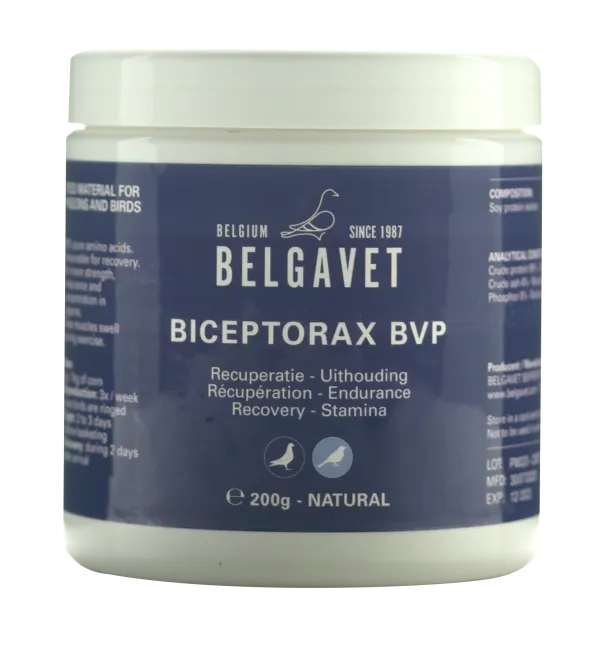Belgavet Biceptorax je dodatak prehrani napravljen za podršku mišićnog razvoja i poboljšanje fizičke kondicije kod golubova i ptica.