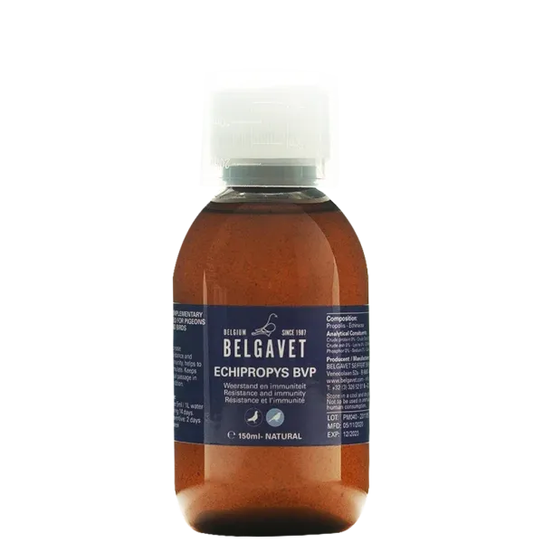 Belgavet Echipropys BVP 150ml za golubove je dodatak ishrani koji poboljšava zdravlje i podržava funkciju probavnog sustava kod golubova. Sadrži kombinaciju prirodnih sastojaka koji pomažu u održavanju zdrave crijevne flore, što je ključno za optimalnu apsorpciju hranjivih tvari i imunitet golubova.