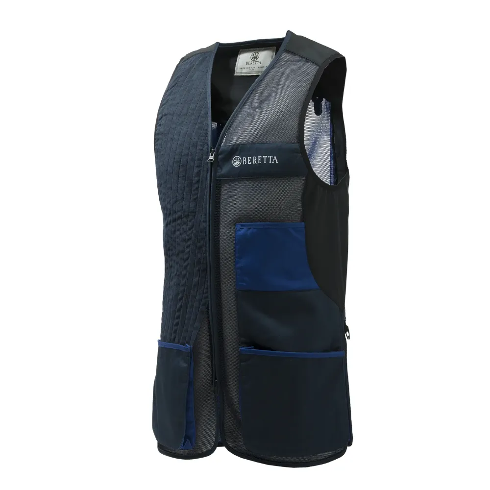 BERETTA UNIFORM PRO 20.20 streljački prsluk od prozračne mreže i rastezljivog pamuka s klizačem od mikrosuedne kože i proširivim prednjim džepovima. Tijelo je gotovo u cijelosti u prozračnoj i elastičnoj 3D mrežici. Bočne stranice od rastezljivog materijala osiguravaju izvrsno pristajanje i slobodu kretanja. Prednji džepovi su proširivi sa skrivenim gumbima.