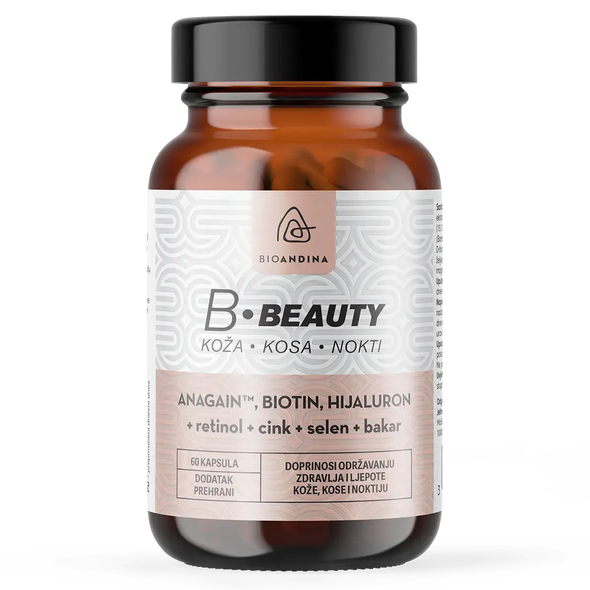 B-BEAUTY je premium dodatak prehrani koji potiče rast kose, jača nokte te vraća koži elastičnost, punoću i hidrataciju.