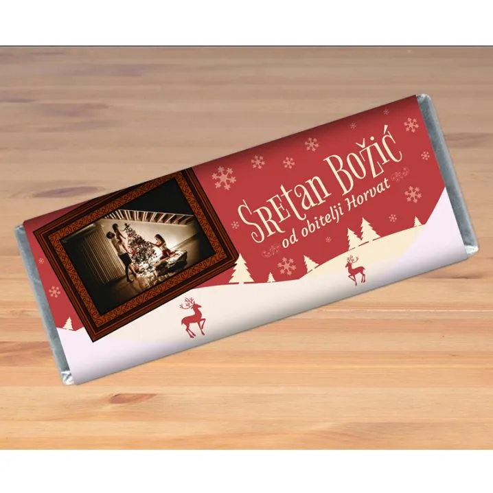 Čestitajte Božić svojim najdražima ovom originalnom čokoladom. Vašu fotografiju i prezime ćemo ukomponirati u dizajn omota. Čokolada je uvijek dobro pogođen poklon, posebice za žensku populaciju. Personaliziranim omotom ćete se izdići iznad gomile monotonih.