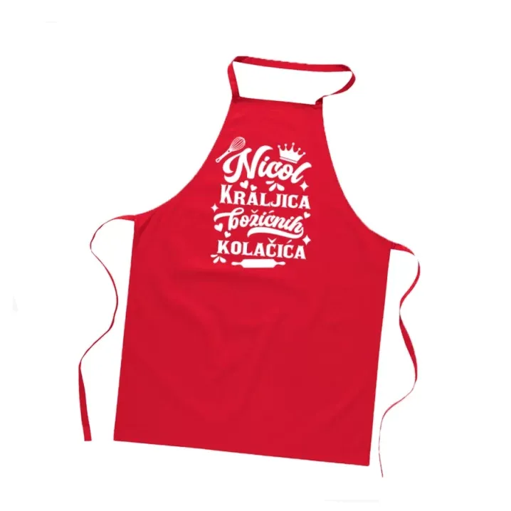 Božićna pregača s imenom i natpisom. Za sve kraljice i kraljeve božićnih kolača, one koji su iznimno spremni u spremanju malih slatkih zalogaja koje svi volimo. Odličan božićni poklon za sve gurmane i slastičare.