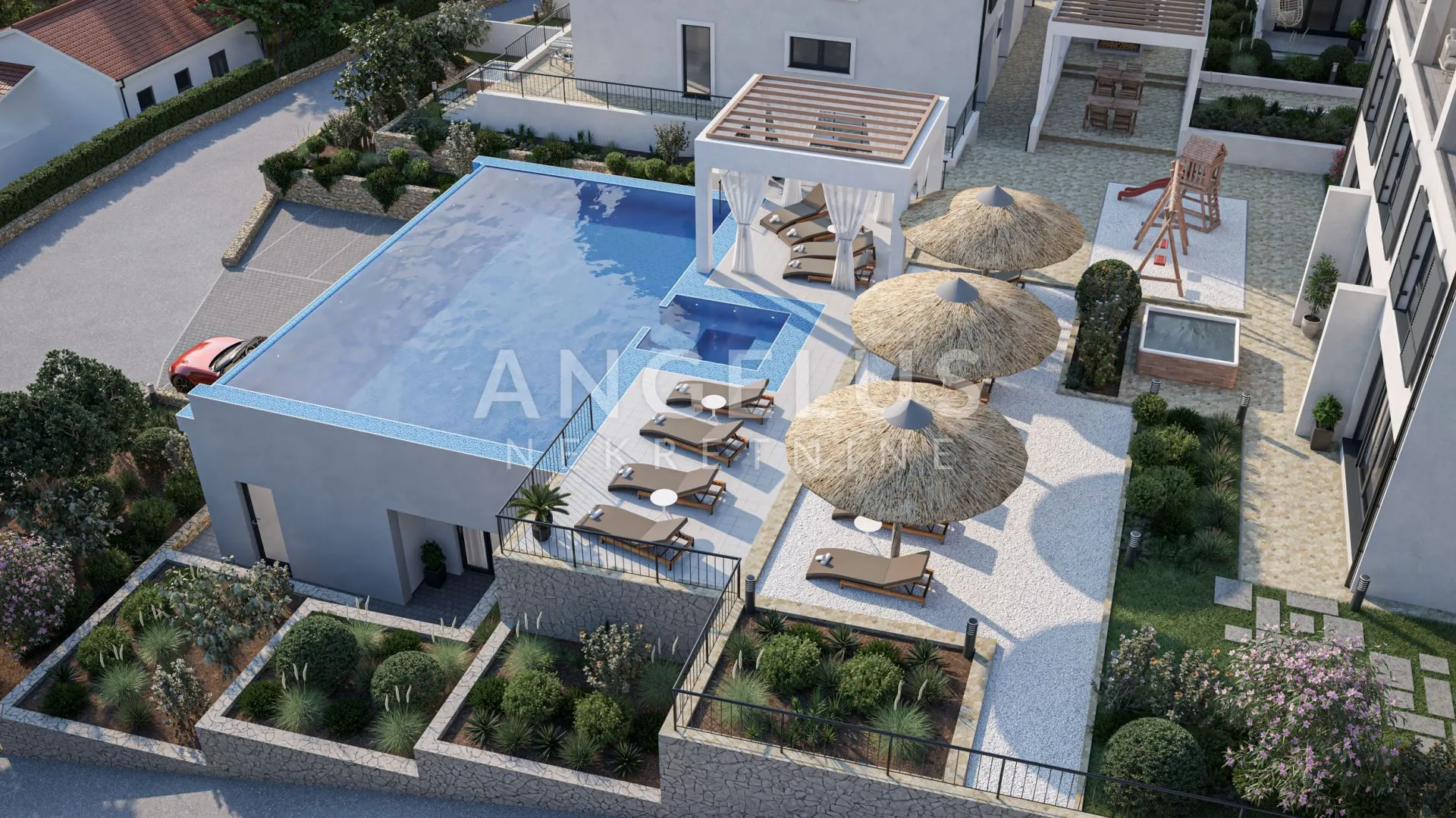 172 m2 stambenog prostora, 1 parkirno mjesto, zajedničko korištenje zelenih površina i dvorišta (ukupna površina 341 m2) te korištenje zajedničkog bazena.