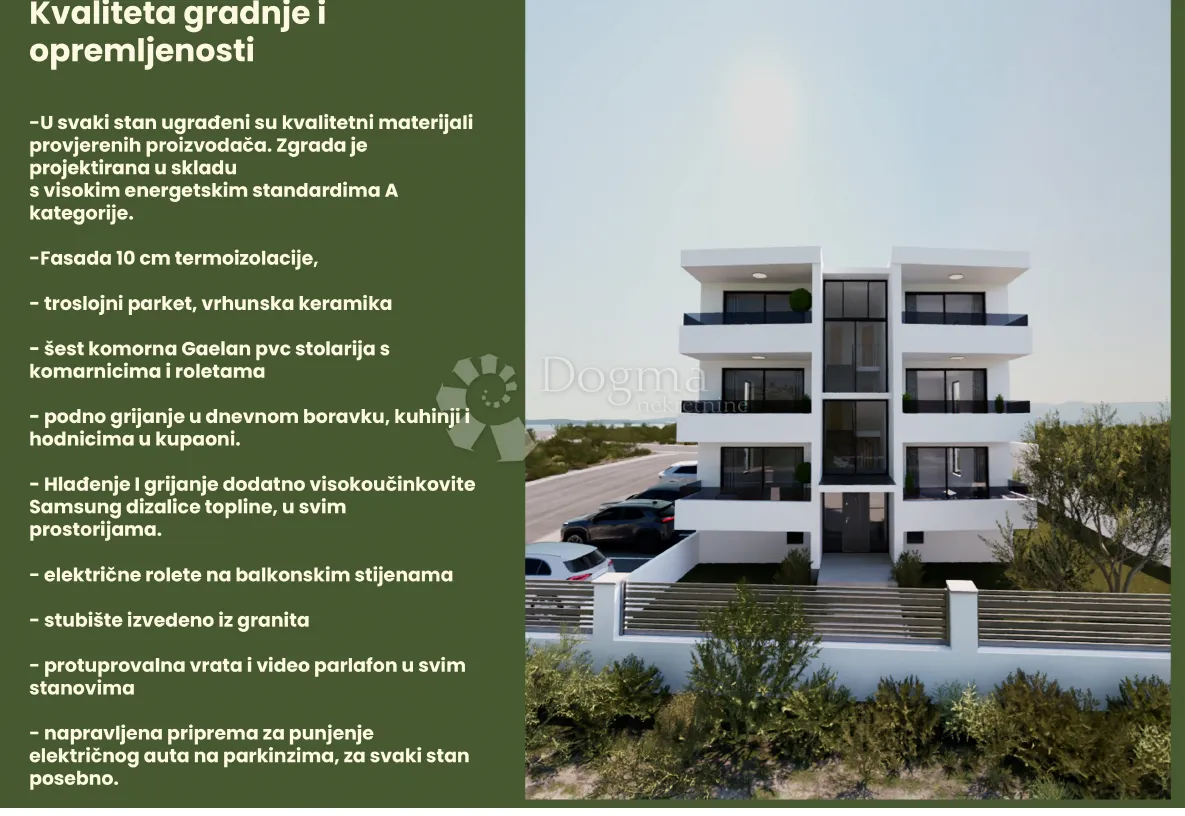 PRODAJA STANA – NOVOGRADNJA, BRODARICA (ŠIBENIK) Top lokacija – 300 m od mora | Pogled na more | 2 parkirna mjesta + spremište Na prodaju je stan u modernoj stambenoj zgradi s ukupno šest stanova, smještenoj na izuzetnoj lokaciji u Brodarici, jednom od najpoželjnijih naselja u okolici Šibenika. Stan se nalazi u mirnom i uređenom okruženju, svega 300 metara od mora. Posebnu vrijednost ove nekretnine čini činjenica da svi stanovi u zgradi imaju pogled na more, a uz stan dolaze dva parkirna mjesta i zasebno spremište, što predstavlja rijetkost na tržištu. ________________________________________ LOKACIJA – BRODARICA Brodarica je jedno od najtraženijih naselja u blizini Šibenika, pogodno za cjelogodišnje stanovanje kao i za turistički najam. U neposrednoj blizini nalaze se: • plaže i šetnice • trgovine i ugostiteljski objekti • škola i vrtić • javni prijevoz i brza prometna povezanost sa Šibenikom ________________________________________ OSNOVNI PODACI O STANU • Oznaka stana: APP 2 • Položaj: prizemlje, desno • Zgrada: novogradnja • Pogled na more • Balkon / loggia • Dva parkirna mjesta • Zasebno spremište u podrumu Sve pripadajuće površine upisuju se kao etažno vlasništvo stana. ________________________________________ POVRŠINE STANA Unutarnji prostori • Kuhinja, blagovaonica i dnevni boravak: 28,10 m² • Hodnik / garderoba: 8,70 m² • Spavaća soba 1: 9,30 m² • Spavaća soba 2: 10,90 m² • Kupaonica: 4,60 m² Dodatni prostori • Loggia: 8,20 m² o obračunski: 4,10 m² • Spremište u podrumu: 5,30 m² o obračunski: 2,65 m² Parkirna mjesta • Parking mjesto 1: 13,75 m² o obračunski: 2,75 m² • Parking mjesto 2: 13,75 m² o obračunski: 2,75 m² ________________________________________ OPIS STANA Stan je funkcionalnog i pažljivo osmišljenog rasporeda. Sastoji se od otvorenog dnevnog prostora koji objedinjuje kuhinju, blagovaonicu i dnevni boravak, dvije spavaće sobe, kupaonice te loggie. Zahvaljujući orijentaciji i velikim staklenim površinama, stan je vrlo svijetao te pruža ugodan pogled na more. Pogodan je za obiteljski život, ali i kao investicija za turistički najam. ________________________________________ KVALITETA GRADNJE I OPREMLJENOST • Visoki energetski standard, A kategorija • Fasada s 10 cm termoizolacije • Troslojni parket i vrhunska keramika • Šestkomorna PVC stolarija (Gaelan) s komarnicima i roletama • Podno grijanje u dnevnom boravku, kuhinji, hodnicima i kupaonici • Grijanje i hlađenje putem Samsung dizalica topline u svim prostorijama • Električne rolete na balkonskim stijenama • Granitno stubište • Protuprovalna vrata i video portafon • Priprema za punjenje električnog vozila na parkirnim mjestima ________________________________________ PARKING I OSTAVA Stanu pripadaju dva parkirna mjesta te zasebna ostava u podrumu. Svaki stan ima vlastitu pripremu za ugradnju punjača za električno vozilo. Sve je uredno upisano kao etažno vlasništvo. ID KOD AGENCIJE: DA100066658 Ante Goleš Agent s licencom Mob: 099/222-3054 Tel: 022/646-360, 022/646-361 E-mail: ante.goles@dogma-nekretnine.com www.dogma-dalmacija.com
