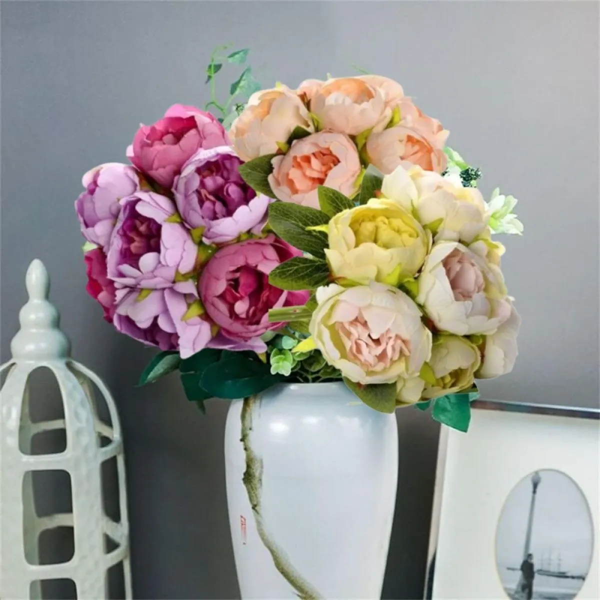 Buket od umjetnog cvijeća dostupan u tri boje: boja breskve, nježno žuta i lila.