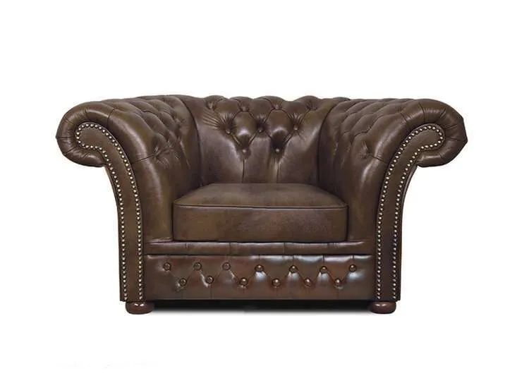 Chesterfield Winfield Basic Luxe leather Fotelja 1-sjedište Cloudy Brown DarkMajstorova ruka u ovoj Chesterfield fotelji Winfield od goveđe kože jasno je prepoznatljiva po lijepo izrađenim detaljima, poput čavala i tapaciranih rukohvata i naslona.Jedan od najvažnijih materijala prilikom proizvodnje kvalitetne Chesterfield fotelje je koža. Chesterfield namještaj ručno je izrađen od visokokvalitetne poluanilinske kože, koja se zatim lakira.Okvir je izrađen od bukovine, koja je zalijepljena i vijčana. Duga tradicija zanatskog umijeća vidljiva je kroz udobnost i izgled Winfielda.Model Chesterfield fotelje ‘Winfield’ jedan je od vrhunskih modela Chesterfielda. Ovaj Chesterfield model od goveđe kože također je dostupan i u vintage koži i tkanini.Uz svaki komad namještaja standardno se pruža certifikat autentičnosti i jamstvo kvalitete. Tehnički podaci