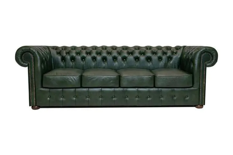 Chesterfield 4-sjedišta sofa Class leather Cloudy GreenRuka majstora u ovom Chesterfield kauču od goveđe kože jasno je prepoznatljiva po lijepo završenim detaljima, poput zakovica i tapeciranih rukohvata i naslona.Jedan od najvažnijih materijala prilikom proizvodnje dobrog Chesterfielda je koža. Chesterfield namještaj izrađuje se ručno od visokokvalitetne poluanilinske kože, koja se zatim lakira.Okvir je napravljen od bukovine, koja je zalijepljena i vijčana. Duga tradicija zanatskog umijeća vidljiva je kroz udobnost i izgled ovog Chesterfielda.Model ‘Klasa’ Chesterfield je model koji svi poznajemo kao pravi Chesterfield. Ovaj Chesterfield model dostupan je samo u goveđoj koži i dostupan je kao Klasa i Prva Klasa.Certifikat autentičnosti i premijum garancija pružaju se standardno uz kupnju svakog komada namještaja.Tehnički podaci