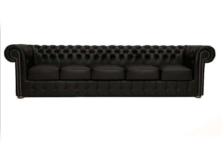 Chesterfield 5-sjedišta sofa Class leather Matt Black Ruka majstora u ovom Chesterfield kauču od goveđe kože jasno je prepoznatljiva po lijepo završenim detaljima, poput zakovica i tapeciranih rukohvata i naslona. Jedan od najvažnijih materijala prilikom proizvodnje dobrog Chesterfielda je koža. Chesterfield namještaj izrađuje se ručno od visokokvalitetne poluanilinske kože, koja se zatim lakira. Okvir je napravljen od bukovine, koja je zalijepljena i vijčana. Duga tradicija zanatskog umijeća vidljiva je kroz udobnost i izgled ovog Chesterfielda. Model ‘Klasa’ Chesterfield je model koji svi poznajemo kao pravi Chesterfield. Ovaj Chesterfield model dostupan je samo u goveđoj koži i dostupan je kao Klasa i Prva Klasa. Certifikat autentičnosti i premijum garancija pružaju se standardno uz kupnju svakog komada namještaja. Tehnički podaci