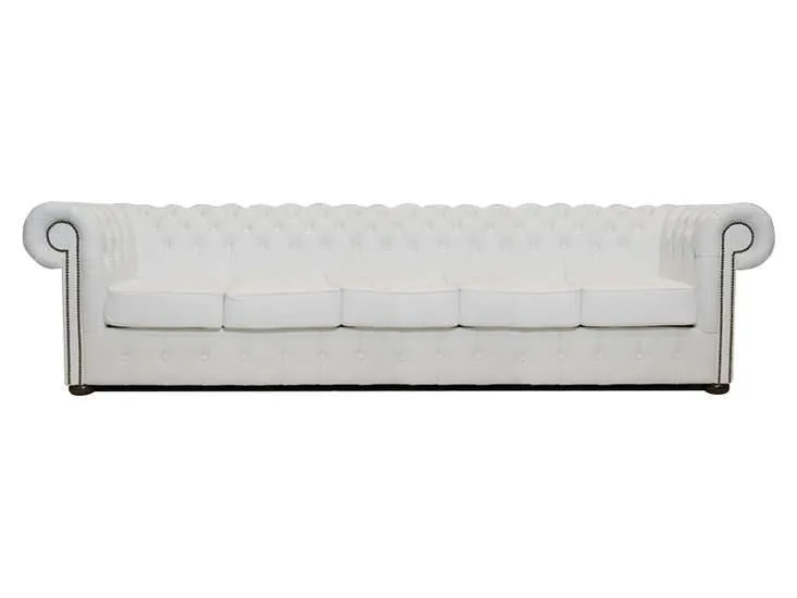 Chesterfield 5-sjedišta sofa Class leather White Ruka majstora u ovom Chesterfield kauču od goveđe kože jasno je prepoznatljiva po lijepo završenim detaljima, poput zakovica i tapeciranih rukohvata i naslona. Jedan od najvažnijih materijala prilikom proizvodnje dobrog Chesterfielda je koža. Chesterfield namještaj izrađuje se ručno od visokokvalitetne poluanilinske kože, koja se zatim lakira. Okvir je napravljen od bukovine, koja je zalijepljena i vijčana. Duga tradicija zanatskog umijeća vidljiva je kroz udobnost i izgled ovog Chesterfielda. Model ‘Klasa’ Chesterfield je model koji svi poznajemo kao pravi Chesterfield. Ovaj Chesterfield model dostupan je samo u goveđoj koži i dostupan je kao Klasa i Prva Klasa. Certifikat autentičnosti i premijum garancija pružaju se standardno uz kupnju svakog komada namještaja. Tehnički podaci
