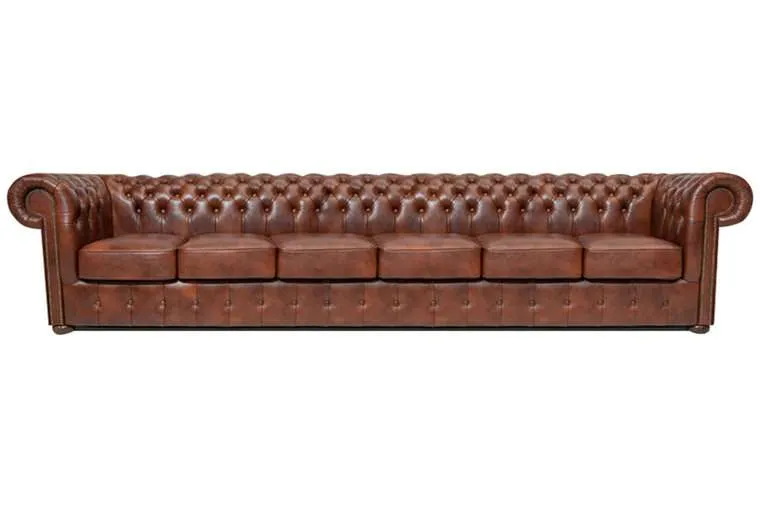 Chesterfield 6-sjedišta sofa Class leather Cloudy Brown Old Ruka majstora u ovom Chesterfield kauču od goveđe kože jasno je prepoznatljiva po lijepo završenim detaljima, poput zakovica i tapeciranih rukohvata i naslona. Jedan od najvažnijih materijala prilikom proizvodnje dobrog Chesterfielda je koža. Chesterfield namještaj izrađuje se ručno od visokokvalitetne poluanilinske kože, koja se zatim lakira. Okvir je napravljen od bukovine, koja je zalijepljena i vijčana. Duga tradicija zanatskog umijeća vidljiva je kroz udobnost i izgled ovog Chesterfielda. Model ‘Klasa’ Chesterfield je model koji svi poznajemo kao pravi Chesterfield. Ovaj Chesterfield model dostupan je samo u goveđoj koži i dostupan je kao Klasa i Prva Klasa. Certifikat autentičnosti i premijum garancija pružaju se standardno uz kupnju svakog komada namještaja. Tehnički podaci