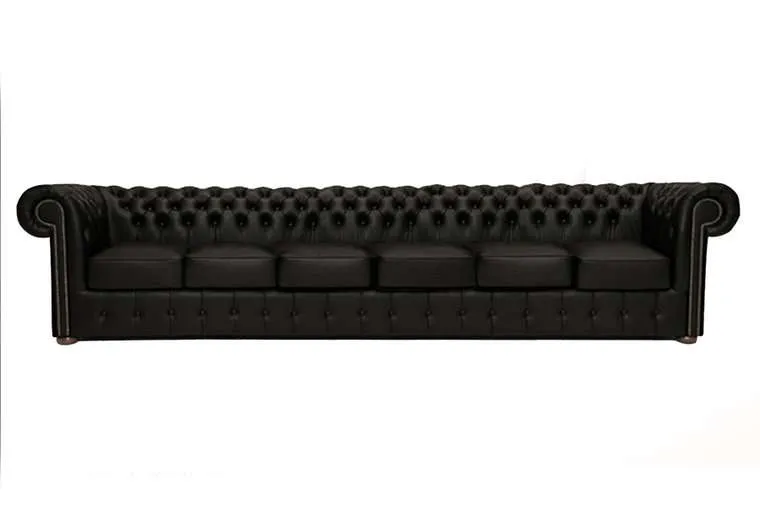 Chesterfield 6-sjedišta sofa Class leather Matt Black Ruka majstora u ovom Chesterfield kauču od goveđe kože jasno je prepoznatljiva po lijepo završenim detaljima, poput zakovica i tapeciranih rukohvata i naslona. Jedan od najvažnijih materijala prilikom proizvodnje dobrog Chesterfielda je koža. Chesterfield namještaj izrađuje se ručno od visokokvalitetne poluanilinske kože, koja se zatim lakira. Okvir je napravljen od bukovine, koja je zalijepljena i vijčana. Duga tradicija zanatskog umijeća vidljiva je kroz udobnost i izgled ovog Chesterfielda. Model ‘Klasa’ Chesterfield je model koji svi poznajemo kao pravi Chesterfield. Ovaj Chesterfield model dostupan je samo u goveđoj koži i dostupan je kao Klasa i Prva Klasa. Certifikat autentičnosti i premijum garancija pružaju se standardno uz kupnju svakog komada namještaja. Tehnički podaci