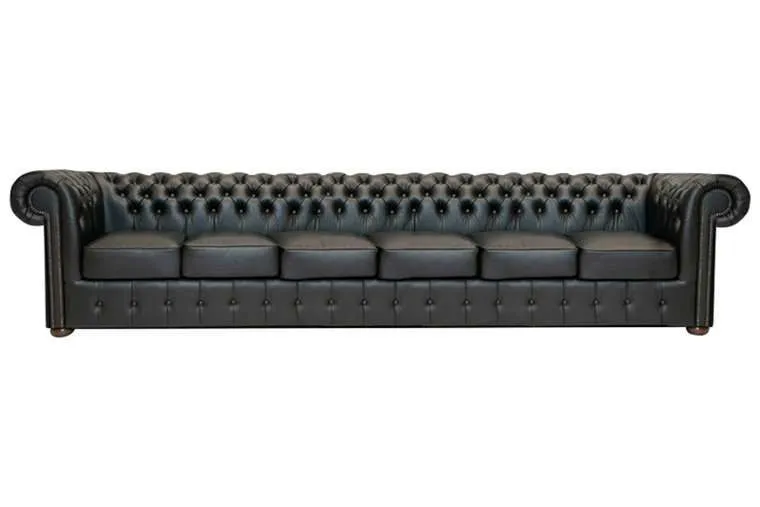 Chesterfield 6-sjedišta sofa Class leather Shiny Black Ruka majstora u ovom Chesterfield kauču od goveđe kože jasno je prepoznatljiva po lijepo završenim detaljima, poput zakovica i tapeciranih rukohvata i naslona. Jedan od najvažnijih materijala prilikom proizvodnje dobrog Chesterfielda je koža. Chesterfield namještaj izrađuje se ručno od visokokvalitetne poluanilinske kože, koja se zatim lakira. Okvir je napravljen od bukovine, koja je zalijepljena i vijčana. Duga tradicija zanatskog umijeća vidljiva je kroz udobnost i izgled ovog Chesterfielda. Model ‘Klasa’ Chesterfield je model koji svi poznajemo kao pravi Chesterfield. Ovaj Chesterfield model dostupan je samo u goveđoj koži i dostupan je kao Klasa i Prva Klasa. Certifikat autentičnosti i premijum garancija pružaju se standardno uz kupnju svakog komada namještaja. Tehnički podaci