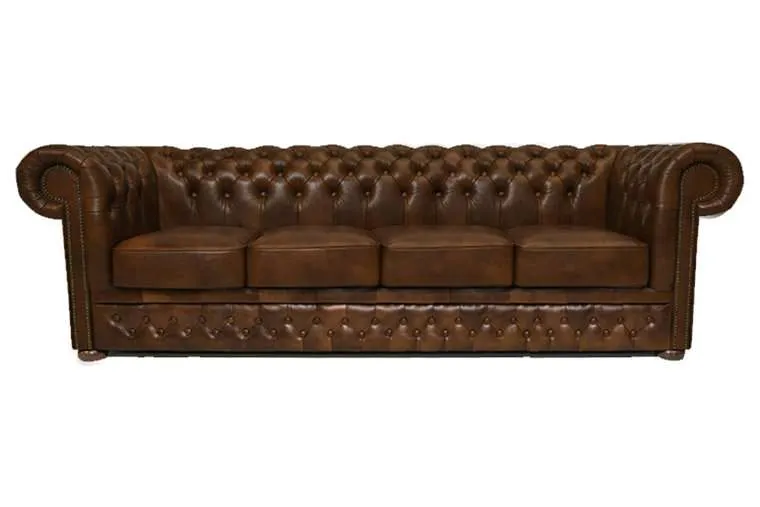 Chesterfield First Class leather 4-sjedišta sofa Cloudy Brown Light Ruka majstora u ovom Chesterfield kauču od goveđe kože prvog razreda jasno je prepoznatljiva po lijepo završenim detaljima, poput zakovica i tapeciranih rukohvata i naslona.Jedan od najvažnijih materijala prilikom proizvodnje dobrog Chesterfield kauča je koža. Chesterfield namještaj izrađuje se ručno od visokokvalitetne polu-anilinske kože, koja se zatim lakira.Okvir je izrađen od bukovog drveta, koje je zalijepljeno i vijčano. Duga tradicija zanatstva vidljiva je kroz udobnost i izgled First Class modela.Chesterfield model ‘First Class’ je model koji svi poznajemo kao pravi Chesterfield. Ovaj Chesterfield model dostupan je samo u goveđoj koži i dostupan je kao Class i First Class.Uz svaki komad namještaja standardno se isporučuje certifikat autentičnosti i premium jamstvo. Tehničke specifikacije