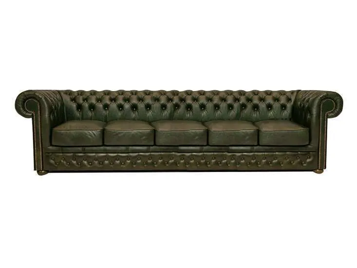 Chesterfield First Class leather 5-sjedišta sofa Moss Green Ruka majstora na ovom Chesterfield kauču od goveđe kože prvog razreda jasno je prepoznatljiva po lijepo završenim detaljima, poput zakovica i tapeciranih rukohvata i naslona.Jedan od najvažnijih materijala prilikom proizvodnje dobrog Chesterfield kauča je koža. Chesterfield namještaj izrađuje se ručno od visokokvalitetne polu-anilinske kože, koja se zatim lakira.Okvir je izrađen od bukovog drveta, koje je zalijepljeno i vijčano. Duga tradicija zanatstva vidljiva je kroz udobnost i izgled klase.Chesterfield model ‘First Class’ je model koji svi poznajemo kao pravi Chesterfield. Ovaj Chesterfield model dostupan je samo u goveđoj koži i dostupan je kao Klasa i Prva klasa.Uz svaki komad namještaja standardno se isporučuje certifikat autentičnosti i jamstvo vrhunske kvalitete. Tehnički podaci