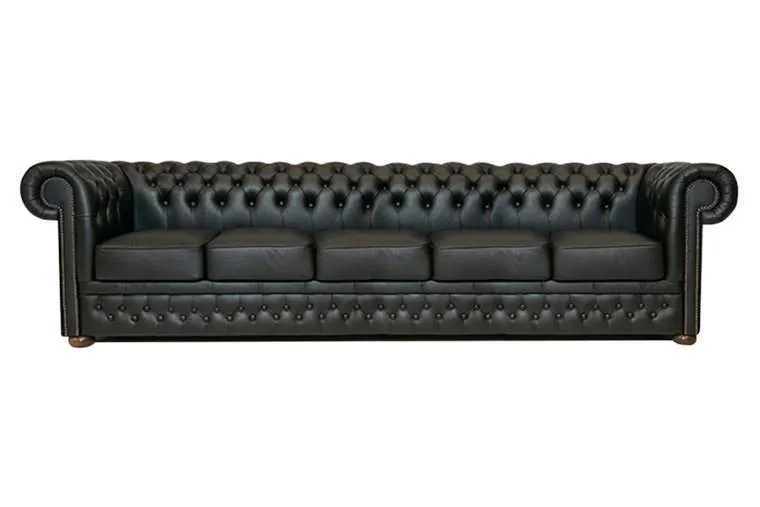 Chesterfield First Class leather 5-sjedišta sofa Shiny Black Ruka majstora na ovom Chesterfield kauču od goveđe kože prvog razreda jasno je prepoznatljiva po lijepo završenim detaljima, poput zakovica i tapeciranih rukohvata i naslona.Jedan od najvažnijih materijala prilikom proizvodnje dobrog Chesterfield kauča je koža. Chesterfield namještaj izrađuje se ručno od visokokvalitetne polu-anilinske kože, koja se zatim lakira.Okvir je izrađen od bukovog drveta, koje je zalijepljeno i vijčano. Duga tradicija zanatstva vidljiva je kroz udobnost i izgled klase.Chesterfield model ‘First Class’ je model koji svi poznajemo kao pravi Chesterfield. Ovaj Chesterfield model dostupan je samo u goveđoj koži i dostupan je kao Klasa i Prva klasa.Uz svaki komad namještaja standardno se isporučuje certifikat autentičnosti i jamstvo vrhunske kvalitete. Tehnički podaci
