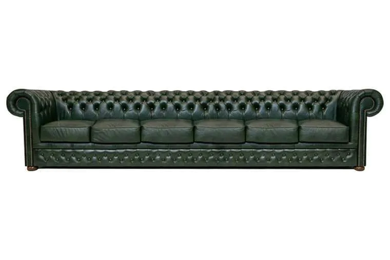 Chesterfield First Class leather 6-sjedišta sofa Cloudy Green Ruka majstora na ovom Chesterfield kauču od goveđe kože prvog razreda jasno je prepoznatljiva po lijepo završenim detaljima, poput zakovica i tapeciranih rukohvata i naslona.Jedan od najvažnijih materijala prilikom proizvodnje dobrog Chesterfield kauča je koža. Chesterfield namještaj izrađuje se ručno od visokokvalitetne polu-anilinske kože, koja se zatim lakira.Okvir je izrađen od bukovog drveta, koje je zalijepljeno i vijčano. Duga tradicija zanatstva vidljiva je kroz udobnost i izgled klase.Chesterfield model ‘First Class’ je model koji svi poznajemo kao pravi Chesterfield. Ovaj Chesterfield model dostupan je samo u goveđoj koži i dostupan je kao Klasa i Prva klasa.Uz svaki komad namještaja standardno se isporučuje certifikat autentičnosti i jamstvo vrhunske kvalitete. Tehnički podaci