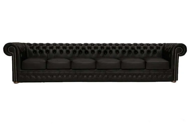 Chesterfield First Class leather 6-sjedišta sofa Matt Black Ruka majstora na ovom Chesterfield kauču od goveđe kože prvog razreda jasno je prepoznatljiva po lijepo završenim detaljima, poput zakovica i tapeciranih rukohvata i naslona.Jedan od najvažnijih materijala prilikom proizvodnje dobrog Chesterfield kauča je koža. Chesterfield namještaj izrađuje se ručno od visokokvalitetne polu-anilinske kože, koja se zatim lakira.Okvir je izrađen od bukovog drveta, koje je zalijepljeno i vijčano. Duga tradicija zanatstva vidljiva je kroz udobnost i izgled klase.Chesterfield model ‘First Class’ je model koji svi poznajemo kao pravi Chesterfield. Ovaj Chesterfield model dostupan je samo u goveđoj koži i dostupan je kao Klasa i Prva klasa.Uz svaki komad namještaja standardno se isporučuje certifikat autentičnosti i jamstvo vrhunske kvalitete. Tehnički podaci