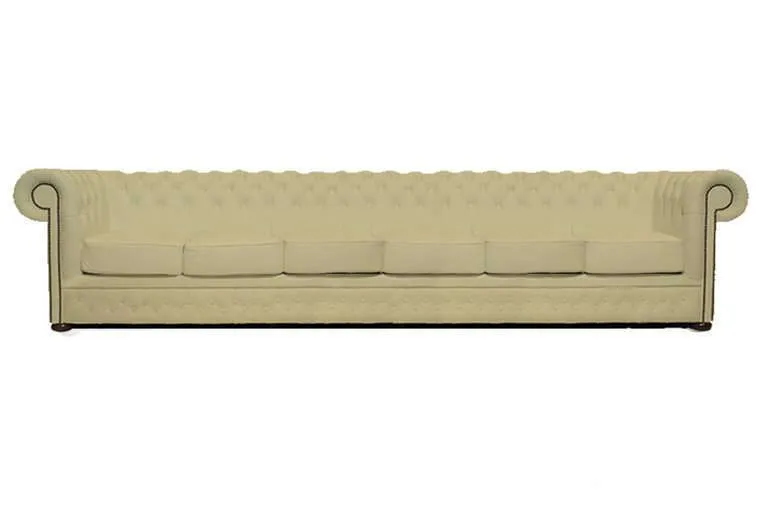 Chesterfield First Class leather 6-sjedišta sofa Vanilla Ruka majstora na ovom Chesterfield kauču od goveđe kože prvog razreda jasno je prepoznatljiva po lijepo završenim detaljima, poput zakovica i tapeciranih rukohvata i naslona.Jedan od najvažnijih materijala prilikom proizvodnje dobrog Chesterfield kauča je koža. Chesterfield namještaj izrađuje se ručno od visokokvalitetne polu-anilinske kože, koja se zatim lakira.Okvir je izrađen od bukovog drveta, koje je zalijepljeno i vijčano. Duga tradicija zanatstva vidljiva je kroz udobnost i izgled klase.Chesterfield model ‘First Class’ je model koji svi poznajemo kao pravi Chesterfield. Ovaj Chesterfield model dostupan je samo u goveđoj koži i dostupan je kao Klasa i Prva klasa.Uz svaki komad namještaja standardno se isporučuje certifikat autentičnosti i jamstvo vrhunske kvalitete. Tehnički podaci