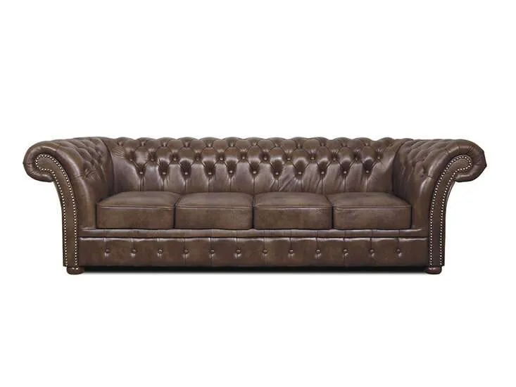 Chesterfield Winfield Basic leather 4-sjedišta sofa Cloudy Brown DarkZanatska ruka u ovoj Chesterfield sofi od goveđe kože Winfield jasno je prepoznatljiva po prekrasno završenim detaljima, poput zakovica i udobnih naslona za ruke i leđa.Jedan od najvažnijih materijala pri proizvodnji dobrog Chesterfielda je koža. Namještaj Chesterfield ručno je izrađen od visokokvalitetne polu-anilinske kože, koja se zatim lakira.Okvir je izrađen od bukovog drveta, koje je zalijepljeno i vijčano. Duga tradicija zanatstva vidljiva je kroz udobnost i izgled Winfielda.Chesterfield model ‘Winfield’ je model koji svi poznajemo kao pravi Chesterfield. Ovaj model Chesterfielda od goveđe kože također je dostupan u vintage koži i tkanini.Certifikat autentičnosti i premijsko jamstvo osiguravaju se standardno prilikom kupnje svakog komada namještaja. Tehnički podaci