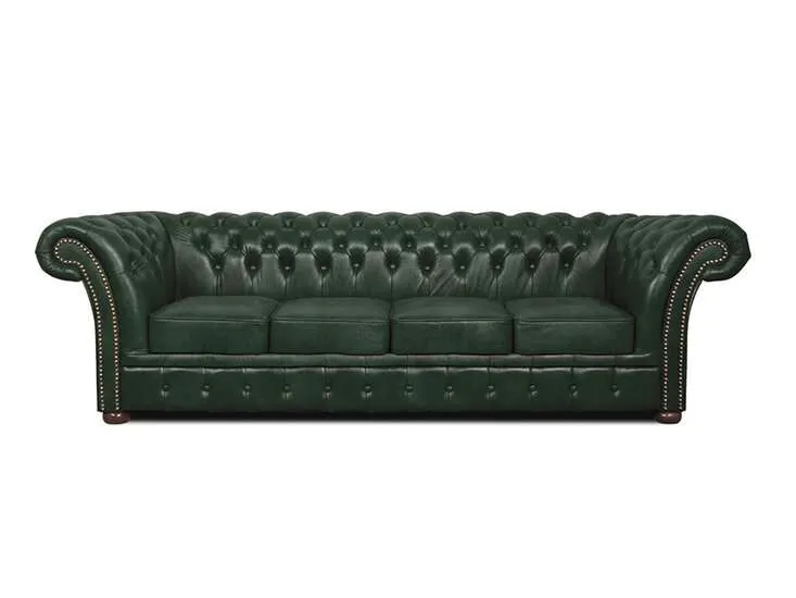 Chesterfield Winfield Basic leather 4-sjedišta sofa Cloudy GreenZanatska ruka u ovoj Chesterfield sofi od goveđe kože Winfield jasno je prepoznatljiva po prekrasno završenim detaljima, poput zakovica i udobnih naslona za ruke i leđa.Jedan od najvažnijih materijala pri proizvodnji dobrog Chesterfielda je koža. Namještaj Chesterfield ručno je izrađen od visokokvalitetne polu-anilinske kože, koja se zatim lakira.Okvir je izrađen od bukovog drveta, koje je zalijepljeno i vijčano. Duga tradicija zanatstva vidljiva je kroz udobnost i izgled Winfielda.Chesterfield model ‘Winfield’ je model koji svi poznajemo kao pravi Chesterfield. Ovaj model Chesterfielda od goveđe kože također je dostupan u vintage koži i tkanini.Certifikat autentičnosti i premijsko jamstvo osiguravaju se standardno prilikom kupnje svakog komada namještaja. Tehnički podaci