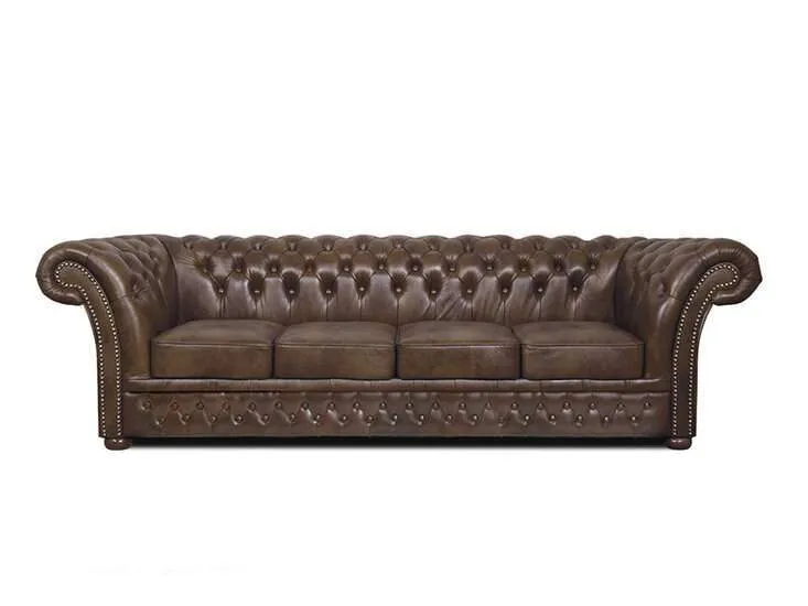 Chesterfield Winfield Basic Luxe leather 4-sjedišta sofa Cloudy Brown DarkZanatska vještina u ovoj Chesterfield sofi od goveđe kože jasno je prepoznatljiva po lijepo završenim detaljima, poput zakovica i presvučenih naslona i leđa.Jedan od najvažnijih materijala pri proizvodnji kvalitetnog Chesterfielda je koža. Chesterfield namještaj izrađuje se ručno od visokokvalitetne poluanilinske kože, koja se zatim lakira.Okvir je izrađen od bukovog drveta, koje je zalijepljeno i vijcima pričvršćeno. Duga tradicija zanatskog umijeća vidljiva je kroz udobnost i izgled Winfielda.Chesterfield model ‘Winfield’ je model koji svi poznajemo kao pravi Chesterfield. Ovaj Chesterfield model od goveđe kože također je dostupan i u vintage koži i tkanini.Uz svaki komad namještaja standardno se isporučuje certifikat autentičnosti i premijerne garancije. Tehničke specifikacije