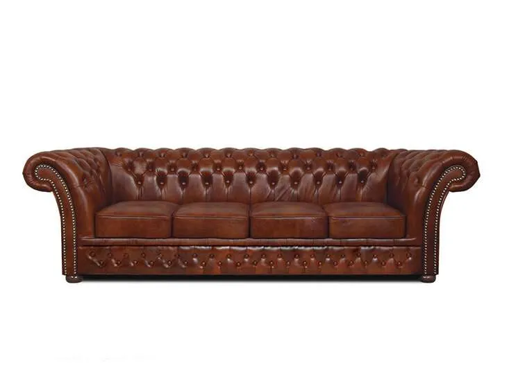 Chesterfield Winfield Basic Luxe leather 4-sjedišta sofa Cloudy CaramelZanatska vještina u ovoj Chesterfield sofi od goveđe kože jasno je prepoznatljiva po lijepo završenim detaljima, poput zakovica i presvučenih naslona i leđa.Jedan od najvažnijih materijala pri proizvodnji kvalitetnog Chesterfielda je koža. Chesterfield namještaj izrađuje se ručno od visokokvalitetne poluanilinske kože, koja se zatim lakira.Okvir je izrađen od bukovog drveta, koje je zalijepljeno i vijcima pričvršćeno. Duga tradicija zanatskog umijeća vidljiva je kroz udobnost i izgled Winfielda.Chesterfield model ‘Winfield’ je model koji svi poznajemo kao pravi Chesterfield. Ovaj Chesterfield model od goveđe kože također je dostupan i u vintage koži i tkanini.Uz svaki komad namještaja standardno se isporučuje certifikat autentičnosti i premijerne garancije. Tehničke specifikacije