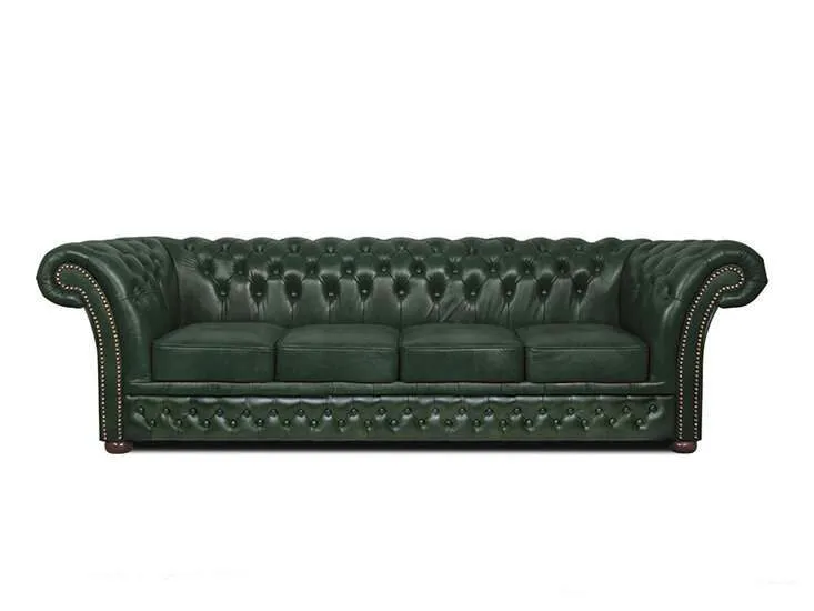Chesterfield Winfield Basic Luxe leather 4-sjedišta sofa Cloudy GreenZanatska vještina u ovoj Chesterfield sofi od goveđe kože jasno je prepoznatljiva po lijepo završenim detaljima, poput zakovica i presvučenih naslona i leđa.Jedan od najvažnijih materijala pri proizvodnji kvalitetnog Chesterfielda je koža. Chesterfield namještaj izrađuje se ručno od visokokvalitetne poluanilinske kože, koja se zatim lakira.Okvir je izrađen od bukovog drveta, koje je zalijepljeno i vijcima pričvršćeno. Duga tradicija zanatskog umijeća vidljiva je kroz udobnost i izgled Winfielda.Chesterfield model ‘Winfield’ je model koji svi poznajemo kao pravi Chesterfield. Ovaj Chesterfield model od goveđe kože također je dostupan i u vintage koži i tkanini.Uz svaki komad namještaja standardno se isporučuje certifikat autentičnosti i premijerne garancije. Tehničke specifikacije