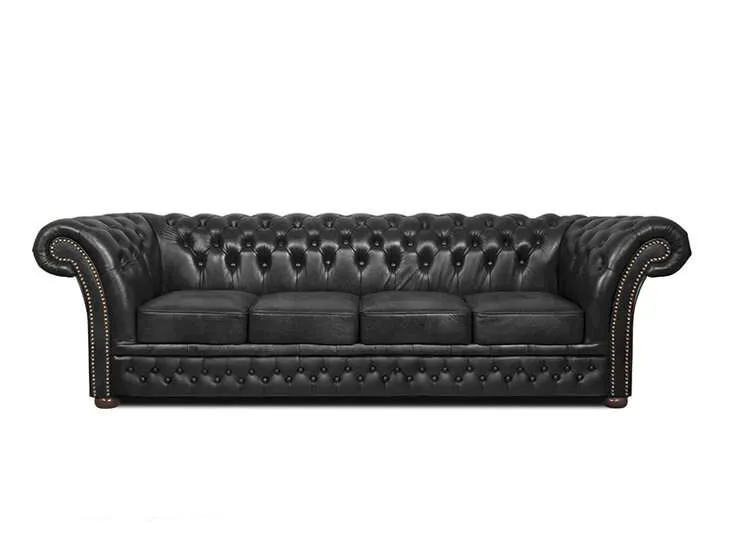 Chesterfield Winfield Basic Luxe leather 4-sjedišta sofa Shiny BlackZanatska vještina u ovoj Chesterfield sofi od goveđe kože jasno je prepoznatljiva po lijepo završenim detaljima, poput zakovica i presvučenih naslona i leđa.Jedan od najvažnijih materijala pri proizvodnji kvalitetnog Chesterfielda je koža. Chesterfield namještaj izrađuje se ručno od visokokvalitetne poluanilinske kože, koja se zatim lakira.Okvir je izrađen od bukovog drveta, koje je zalijepljeno i vijcima pričvršćeno. Duga tradicija zanatskog umijeća vidljiva je kroz udobnost i izgled Winfielda.Chesterfield model ‘Winfield’ je model koji svi poznajemo kao pravi Chesterfield. Ovaj Chesterfield model od goveđe kože također je dostupan i u vintage koži i tkanini.Uz svaki komad namještaja standardno se isporučuje certifikat autentičnosti i premijerne garancije. Tehničke specifikacije