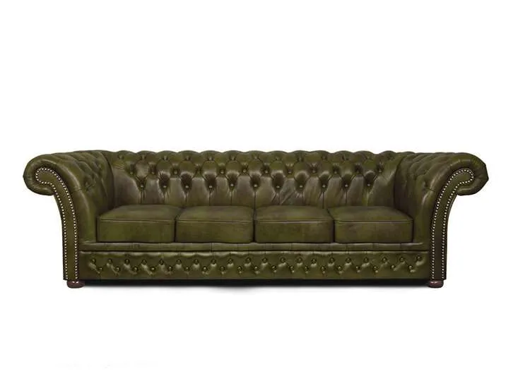 Chesterfield Winfield Basic Luxe leather 4-sjedišta sofa Moss GreenZanatska vještina u ovoj Chesterfield sofi od goveđe kože jasno je prepoznatljiva po lijepo završenim detaljima, poput zakovica i presvučenih naslona i leđa.Jedan od najvažnijih materijala pri proizvodnji kvalitetnog Chesterfielda je koža. Chesterfield namještaj izrađuje se ručno od visokokvalitetne poluanilinske kože, koja se zatim lakira.Okvir je izrađen od bukovog drveta, koje je zalijepljeno i vijcima pričvršćeno. Duga tradicija zanatskog umijeća vidljiva je kroz udobnost i izgled Winfielda.Chesterfield model ‘Winfield’ je model koji svi poznajemo kao pravi Chesterfield. Ovaj Chesterfield model od goveđe kože također je dostupan i u vintage koži i tkanini.Uz svaki komad namještaja standardno se isporučuje certifikat autentičnosti i premijerne garancije. Tehničke specifikacije