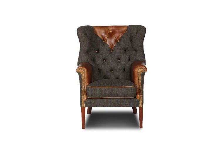 Chesterfield Harris Tweed fotelja Kniphofia presvučena Tweed vunom i Cerato kožom The Kniphofia Chesterfield fotelja je presvučena s karakterističnom kombinacijom Harris Tweed tkanine i talijanske Cerato goveđe kože. Ova fotelja ima visok naslon koji vodi do mekih ali čvrstih naslona za ruke. Chesterfield fotelja je napravljena s prekrasnim drvenim nogama. Koristimo samo originalnu Tweed tkaninu s Orb kvalitetnom oznakom za Harris Tweed kolekciju. To je utisnuto na tkanini od strane pravnog odjela Harris Tweed Udruženja. Tweed je prvo obojen, zatim pređen na poseban način i zatim ručno tkani. Ovaj luksuzni Tweed je 100% izrađen od čiste nove vune i poznat je po svojoj ugodnoj toplini, prozračnosti i dugotrajnosti. Chesterfield fotelja Kniphofia je dostupna u različitim bojama vune i kože. Možete prilagoditi kombinaciju boja prema svojoj želji i stvoriti svoju Chesterfield Harris Tweed fotelju. Dobit ćete Certifikat autentičnosti na certificiranom papiru s Chesterfield foteljom Kniphofia. Ovaj Chesterfield certifikat uključuje proizvodni broj s pečatom voska i žigom. Certifikat je usko povezan s House of Chesterfield uvjetima prijenosne garancije. Prijenosna garancija na prodaju je ekskluzivna na tržištu namještaja i pruža je samo House of Chesterfield na svim svojim Chesterfields. Pravimo 3-godišnju garanciju na kožu i Tweed vunu na svakom Chesterfield Harris Tweed namještaju, kao i 12-godišnju garanciju na okvir. Tehničke specifikacije