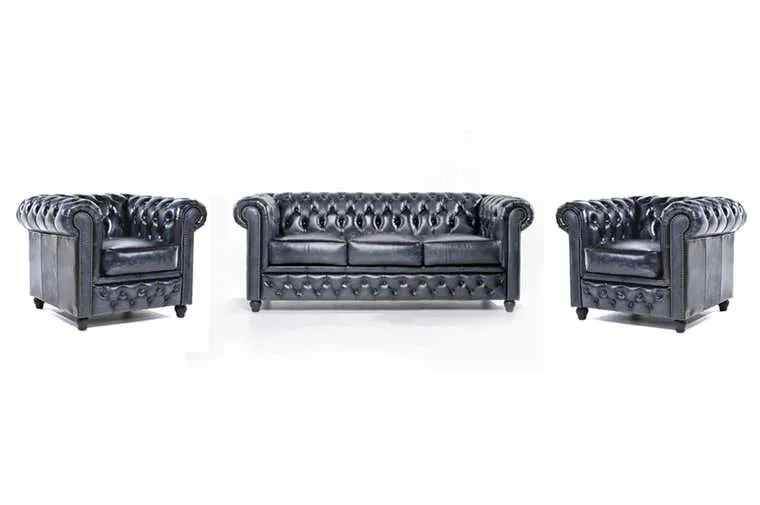 Chesterfield Original leather Wash Off Blue 1 + 1 + 3-sjedištaOva kombinacija, iz najboljeg modela Original tvrtke House of Chesterfield, dostupna je u više različitih kombinacija.Ruka majstora na ovim komadima namještaja od goveđe kože jasno je prepoznatljiva po lijepo završenim detaljima, poput čivita i podstavljenih rukohvata i naslona.Jedan od najvažnijih materijala prilikom proizvodnje dobrog Chesterfield kauča je koža. Chesterfield namještaj izrađuje se ručno od visokokvalitetne polu-anilinske kože, koja se zatim lakira.Duga tradicija zanatstva vidljiva je kroz udobnost i izgled Originala.Chesterfield model ‘Original’ je model koji svi poznajemo kao pravi Chesterfield.Ova kombinacija Chesterfield kauča u goveđoj koži također je dostupna u vintage goveđoj koži i tkanini. Tehnički podaci