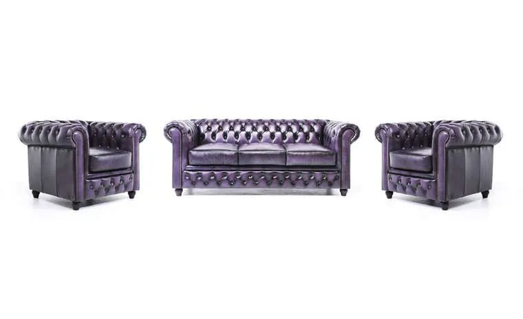 Chesterfield Original leather Wash Off Purple 1 + 1 + 3-sjedištaOva kombinacija, iz najboljeg modela Original tvrtke House of Chesterfield, dostupna je u više različitih kombinacija.Ruka majstora na ovim komadima namještaja od goveđe kože jasno je prepoznatljiva po lijepo završenim detaljima, poput čivita i podstavljenih rukohvata i naslona.Jedan od najvažnijih materijala prilikom proizvodnje dobrog Chesterfield kauča je koža. Chesterfield namještaj izrađuje se ručno od visokokvalitetne polu-anilinske kože, koja se zatim lakira.Duga tradicija zanatstva vidljiva je kroz udobnost i izgled Originala.Chesterfield model ‘Original’ je model koji svi poznajemo kao pravi Chesterfield.Ova kombinacija Chesterfield kauča u goveđoj koži također je dostupna u vintage goveđoj koži i tkanini. Tehnički podaci