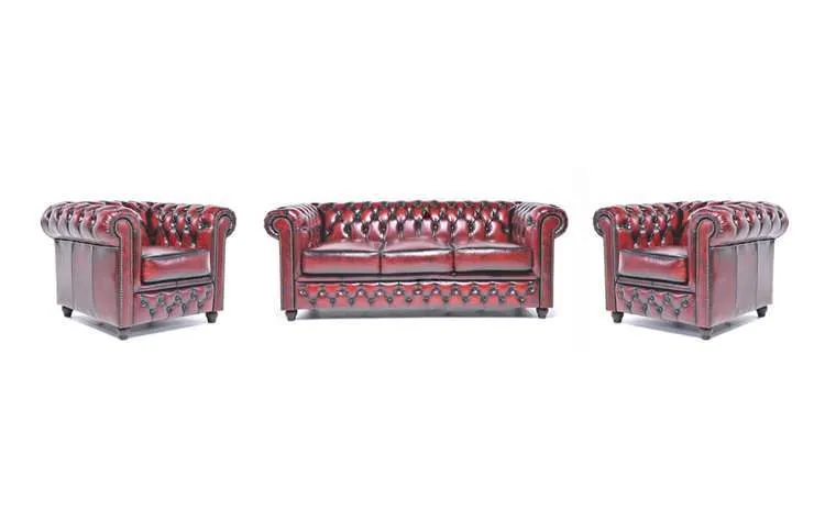 Chesterfield Original leather Wash Off Red 1 + 1 + 3-sjedištaOva kombinacija, iz najboljeg modela Original tvrtke House of Chesterfield, dostupna je u više različitih kombinacija.Ruka majstora na ovim komadima namještaja od goveđe kože jasno je prepoznatljiva po lijepo završenim detaljima, poput čivita i podstavljenih rukohvata i naslona.Jedan od najvažnijih materijala prilikom proizvodnje dobrog Chesterfield kauča je koža. Chesterfield namještaj izrađuje se ručno od visokokvalitetne polu-anilinske kože, koja se zatim lakira.Duga tradicija zanatstva vidljiva je kroz udobnost i izgled Originala.Chesterfield model ‘Original’ je model koji svi poznajemo kao pravi Chesterfield.Ova kombinacija Chesterfield kauča u goveđoj koži također je dostupna u vintage goveđoj koži i tkanini. Tehnički podaci