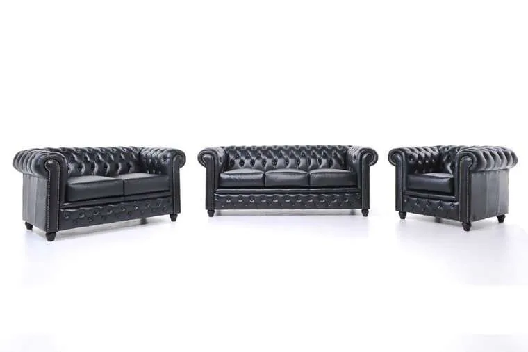 Chesterfield Original leather Black 1 + 2 + 3-sjedištaOva kombinacija, iz House of Chesterfield-ovog vrhunskog modela Original, dostupna je u više različitih kombinacija. Ruka zanatlije u ovim komadima namještaja od goveđe kože jasno je prepoznatljiva po prekrasno završenim detaljima, poput zakovica i udobnih naslona za ruke i leđa.Jedan od najvažnijih materijala pri proizvodnji dobrog Chesterfielda je koža. Namještaj Chesterfield ručno je izrađen od visokokvalitetne polu-anilinske kože, koja se zatim lakira.Duga tradicija zanatstva vidljiva je kroz udobnost i izgled Originala.Originalni Chesterfield model je model koji svi poznajemo kao pravi Chesterfield.Ova kombinacija Chesterfielda od goveđe kože također je dostupna u vintage goveđoj koži i tkanini. Tehnički podaci