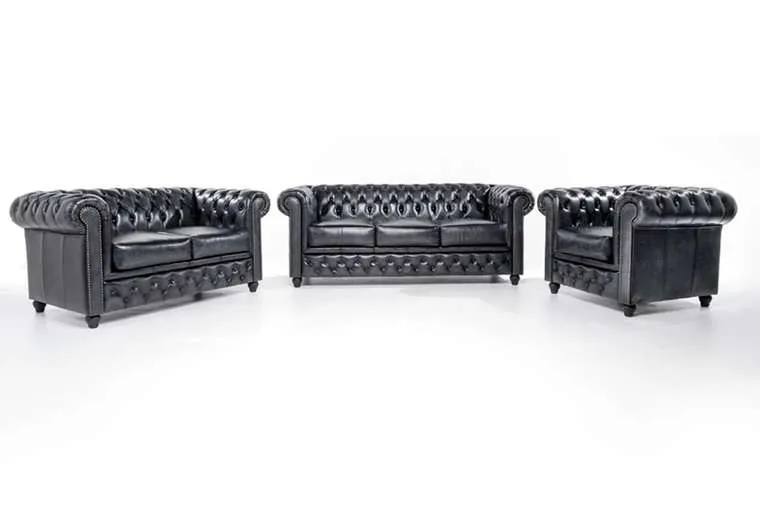 Chesterfield Original leather Wash Off Blue 1 + 2 + 3-sjedištaOva kombinacija, iz House of Chesterfield-ovog vrhunskog modela Original, dostupna je u više različitih kombinacija. Ruka zanatlije u ovim komadima namještaja od goveđe kože jasno je prepoznatljiva po prekrasno završenim detaljima, poput zakovica i udobnih naslona za ruke i leđa.Jedan od najvažnijih materijala pri proizvodnji dobrog Chesterfielda je koža. Namještaj Chesterfield ručno je izrađen od visokokvalitetne polu-anilinske kože, koja se zatim lakira.Duga tradicija zanatstva vidljiva je kroz udobnost i izgled Originala.Originalni Chesterfield model je model koji svi poznajemo kao pravi Chesterfield.Ova kombinacija Chesterfielda od goveđe kože također je dostupna u vintage goveđoj koži i tkanini. Tehnički podaci