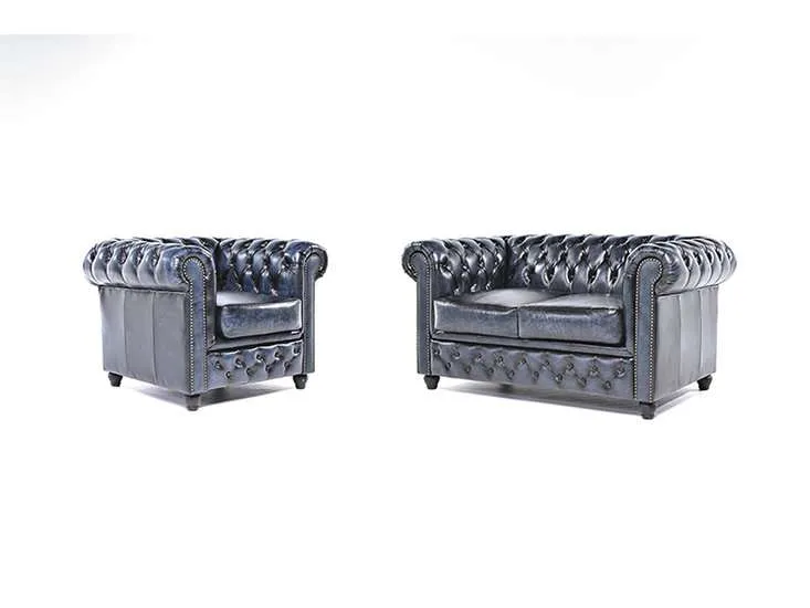 Chesterfield Original leather Wash Off Blue 1 + 2-sjedištaOva kombinacija, iz House of Chesterfield-ovog vrhunskog modela Original, dostupna je u više različitih kombinacija. Ruka zanatlije u ovim komadima namještaja od goveđe kože jasno je prepoznatljiva po prekrasno završenim detaljima, poput zakovica i udobnih naslona za ruke i leđa.Jedan od najvažnijih materijala pri proizvodnji dobrog Chesterfielda je koža. Namještaj Chesterfield ručno je izrađen od visokokvalitetne polu-anilinske kože, koja se zatim lakira.Duga tradicija zanatstva vidljiva je kroz udobnost i izgled Originala.Originalni Chesterfield model je model koji svi poznajemo kao pravi Chesterfield.Ova kombinacija Chesterfielda od goveđe kože također je dostupna u vintage goveđoj koži i tkanini. Tehnički podaci