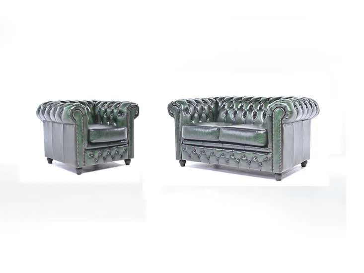 Chesterfield Original leather Wash Off Green 1 + 2-sjedištaOva kombinacija, iz House of Chesterfield-ovog vrhunskog modela Original, dostupna je u više različitih kombinacija. Ruka zanatlije u ovim komadima namještaja od goveđe kože jasno je prepoznatljiva po prekrasno završenim detaljima, poput zakovica i udobnih naslona za ruke i leđa.Jedan od najvažnijih materijala pri proizvodnji dobrog Chesterfielda je koža. Namještaj Chesterfield ručno je izrađen od visokokvalitetne polu-anilinske kože, koja se zatim lakira.Duga tradicija zanatstva vidljiva je kroz udobnost i izgled Originala.Originalni Chesterfield model je model koji svi poznajemo kao pravi Chesterfield.Ova kombinacija Chesterfielda od goveđe kože također je dostupna u vintage goveđoj koži i tkanini. Tehnički podaci