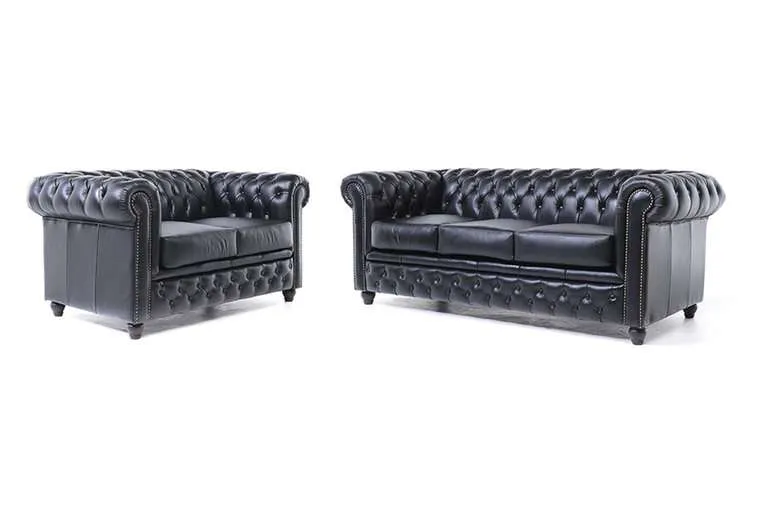 Chesterfield Original leather Black 2 + 3-sjedištaOva kombinacija, iz House of Chesterfield-ovog vrhunskog modela Original, dostupna je u više različitih kombinacija. Ruka zanatlije u ovim komadima namještaja od goveđe kože jasno je prepoznatljiva po prekrasno završenim detaljima, poput zakovica i udobnih naslona za ruke i leđa.Jedan od najvažnijih materijala pri proizvodnji dobrog Chesterfielda je koža. Namještaj Chesterfield ručno je izrađen od visokokvalitetne polu-anilinske kože, koja se zatim lakira.Duga tradicija zanatstva vidljiva je kroz udobnost i izgled Originala.Originalni Chesterfield model je model koji svi poznajemo kao pravi Chesterfield.Ova kombinacija Chesterfielda od goveđe kože također je dostupna u vintage goveđoj koži i tkanini. Tehnički podaci
