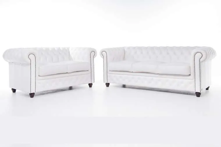 Chesterfield Original leather White 2 + 3-sjedištaOva kombinacija, iz House of Chesterfieldovog vrhunskog modela Original, dostupna je u više različitih kombinacija. Ruka zanatlije u ovim komadima namještaja od goveđe kože jasno je prepoznatljiva po prekrasno završenim detaljima, poput zakovica i udobnih naslona za ruke i leđa.Jedan od najvažnijih materijala pri proizvodnji dobrog Chesterfielda je koža. Namještaj Chesterfield ručno je izrađen od visokokvalitetne polu-anilinske kože, koja se zatim lakira.Duga tradicija zanatstva vidljiva je kroz udobnost i izgled Originala.Originalni Chesterfield model je model koji svi poznajemo kao pravi Chesterfield.Ova kombinacija Chesterfielda od goveđe kože također je dostupna u vintage goveđoj koži i tkanini. Tehnički podaci