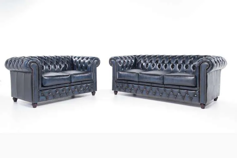 Chesterfield Original leather Wash Off Blue 2 + 3-sjedištaOva kombinacija, iz House of Chesterfield-ovog vrhunskog modela Original, dostupna je u više različitih kombinacija. Ruka zanatlije u ovim komadima namještaja od goveđe kože jasno je prepoznatljiva po prekrasno završenim detaljima, poput zakovica i udobnih naslona za ruke i leđa.Jedan od najvažnijih materijala pri proizvodnji dobrog Chesterfielda je koža. Namještaj Chesterfield ručno je izrađen od visokokvalitetne polu-anilinske kože, koja se zatim lakira.Duga tradicija zanatstva vidljiva je kroz udobnost i izgled Originala.Originalni Chesterfield model je model koji svi poznajemo kao pravi Chesterfield.Ova kombinacija Chesterfielda od goveđe kože također je dostupna u vintage goveđoj koži i tkanini. Tehnički podaci