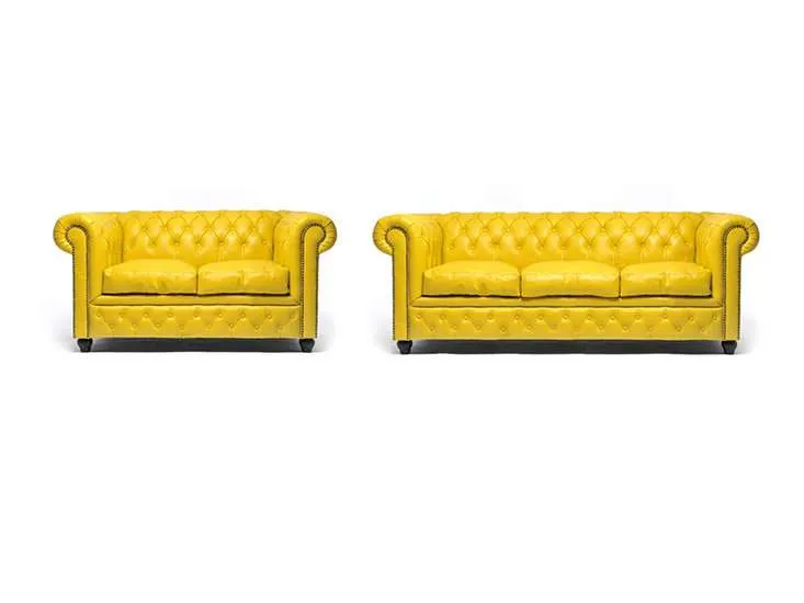 Chesterfield Original leather Yellow 2 + 3-sjedištaOva kombinacija, iz House of Chesterfield-ovog vrhunskog modela Original, dostupna je u više različitih kombinacija. Ruka zanatlije u ovim komadima namještaja od goveđe kože jasno je prepoznatljiva po prekrasno završenim detaljima, poput zakovica i udobnih naslona za ruke i leđa.Jedan od najvažnijih materijala pri proizvodnji dobrog Chesterfielda je koža. Namještaj Chesterfield ručno je izrađen od visokokvalitetne polu-anilinske kože, koja se zatim lakira.Duga tradicija zanatstva vidljiva je kroz udobnost i izgled Originala.Originalni Chesterfield model je model koji svi poznajemo kao pravi Chesterfield.Ova kombinacija Chesterfielda od goveđe kože također je dostupna u vintage goveđoj koži i tkanini. Tehnički podaci