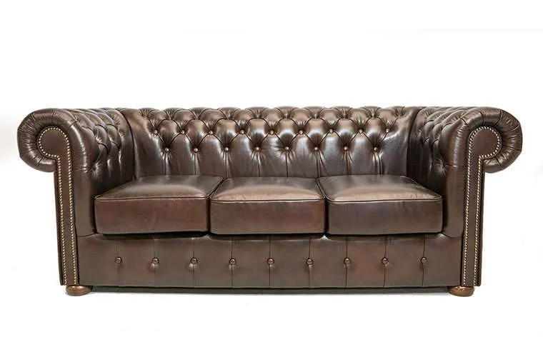 Chesterfield 3-sjedišta sofa Class leather Cloudy Brown DarkRuka majstora u ovom Chesterfield kauču od goveđe kože jasno je prepoznatljiva po lijepo završenim detaljima, poput zakovica i tapeciranih rukohvata i naslona.Jedan od najvažnijih materijala prilikom proizvodnje dobrog Chesterfielda je koža. Chesterfield namještaj izrađuje se ručno od visokokvalitetne poluanilinske kože, koja se zatim lakira.Okvir je napravljen od bukovine, koja je zalijepljena i vijčana. Duga tradicija zanatskog umijeća vidljiva je kroz udobnost i izgled ovog Chesterfielda.Model ‘Klasa’ Chesterfield je model koji svi poznajemo kao pravi Chesterfield. Ovaj Chesterfield model dostupan je samo u goveđoj koži i dostupan je kao Klasa i Prva Klasa.Certifikat autentičnosti i premijum garancija pružaju se standardno uz kupnju svakog komada namještaja.Tehnički podaci