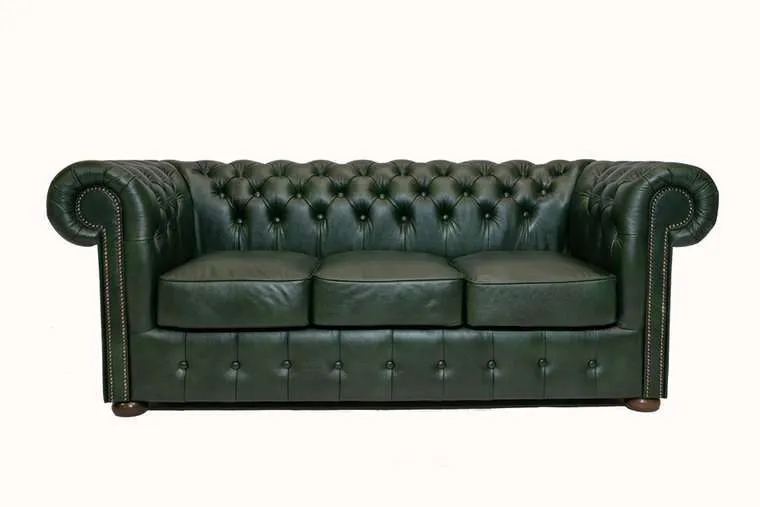 Chesterfield 3-sjedišta sofa Class leather Cloudy GreenRuka majstora u ovom Chesterfield kauču od goveđe kože jasno je prepoznatljiva po lijepo završenim detaljima, poput zakovica i tapeciranih rukohvata i naslona.Jedan od najvažnijih materijala prilikom proizvodnje dobrog Chesterfielda je koža. Chesterfield namještaj izrađuje se ručno od visokokvalitetne poluanilinske kože, koja se zatim lakira.Okvir je napravljen od bukovine, koja je zalijepljena i vijčana. Duga tradicija zanatskog umijeća vidljiva je kroz udobnost i izgled ovog Chesterfielda.Model ‘Klasa’ Chesterfield je model koji svi poznajemo kao pravi Chesterfield. Ovaj Chesterfield model dostupan je samo u goveđoj koži i dostupan je kao Klasa i Prva Klasa.Certifikat autentičnosti i premijum garancija pružaju se standardno uz kupnju svakog komada namještaja.Tehnički podaci