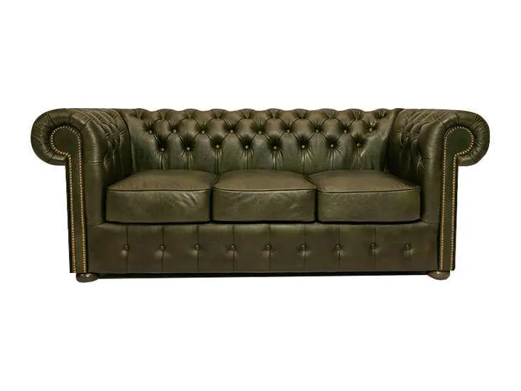 Chesterfield 3-sjedišta sofa Class leather Moss GreenRuka majstora u ovom Chesterfield kauču od goveđe kože jasno je prepoznatljiva po lijepo završenim detaljima, poput zakovica i tapeciranih rukohvata i naslona.Jedan od najvažnijih materijala prilikom proizvodnje dobrog Chesterfielda je koža. Chesterfield namještaj izrađuje se ručno od visokokvalitetne poluanilinske kože, koja se zatim lakira.Okvir je napravljen od bukovine, koja je zalijepljena i vijčana. Duga tradicija zanatskog umijeća vidljiva je kroz udobnost i izgled ovog Chesterfielda.Model ‘Klasa’ Chesterfield je model koji svi poznajemo kao pravi Chesterfield. Ovaj Chesterfield model dostupan je samo u goveđoj koži i dostupan je kao Klasa i Prva Klasa.Certifikat autentičnosti i premijum garancija pružaju se standardno uz kupnju svakog komada namještaja.Tehnički podaci