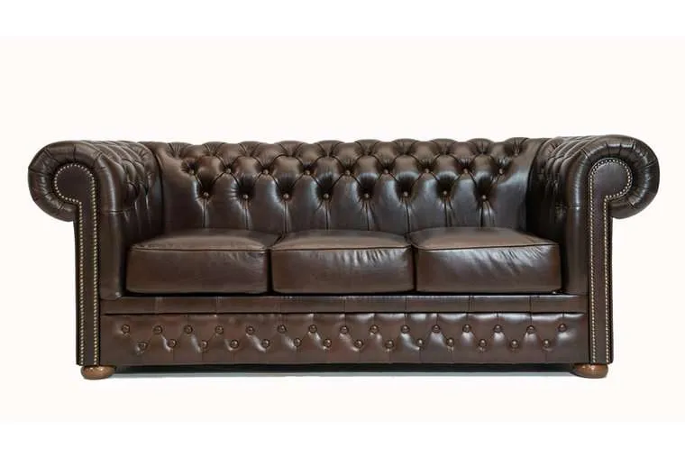 Chesterfield First Class leather 3-sjedišta sofa Cloudy Brown Dark Ruka majstora u ovom Chesterfield kauču od goveđe kože prvog razreda jasno je prepoznatljiva po lijepo završenim detaljima, poput zakovica i tapeciranih rukohvata i naslona. Jedan od najvažnijih materijala prilikom proizvodnje dobrog Chesterfielda je koža. Chesterfield namještaj izrađuje se ručno od visokokvalitetne poluanilinske kože, koja se zatim lakira. Okvir je izrađen od bukovine, koja se lijepli i vijča. Duga tradicija zanatstva vidljiva je kroz udobnost i izgled Chesterfielda. Chesterfield model ‘First Class’ je model koji svi prepoznajemo kao pravi Chesterfield. Ovaj model Chesterfielda dostupan je samo u goveđoj koži i dostupan je kao klasa i prva klasa. Potvrda o autentičnosti i jamstvo kvalitete standardni su uz svaki kupljeni komad namještaja. Tehnički podaci