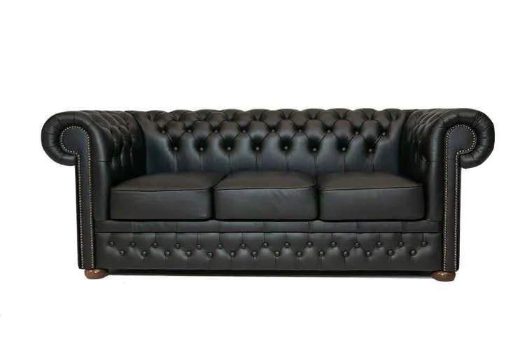 Chesterfield First Class leather 3-sjedišta sofa Shiny Black Ruka majstora u ovom Chesterfield kauču od goveđe kože prvog razreda jasno je prepoznatljiva po lijepo završenim detaljima, poput zakovica i tapeciranih rukohvata i naslona. Jedan od najvažnijih materijala prilikom proizvodnje dobrog Chesterfielda je koža. Chesterfield namještaj izrađuje se ručno od visokokvalitetne poluanilinske kože, koja se zatim lakira. Okvir je izrađen od bukovine, koja se lijepli i vijča. Duga tradicija zanatstva vidljiva je kroz udobnost i izgled Chesterfielda. Chesterfield model ‘First Class’ je model koji svi prepoznajemo kao pravi Chesterfield. Ovaj model Chesterfielda dostupan je samo u goveđoj koži i dostupan je kao klasa i prva klasa. Potvrda o autentičnosti i jamstvo kvalitete standardni su uz svaki kupljeni komad namještaja. Tehnički podaci